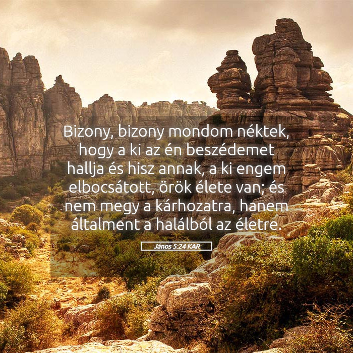 János 5:24 – „Bizony, bizony mondom néktek: A ki az én beszédemet hallja, és hisz annak, a ki engem elbocsátott, örök élete van; és nem megy a kárhozatra, hanem általment a halálból az életre.”