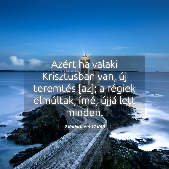2 Korinthus 5:17 – „Azért ha valaki Krisztusban van, új teremtés az: a régiek elmúltak, ímé, újjá lett minden.”